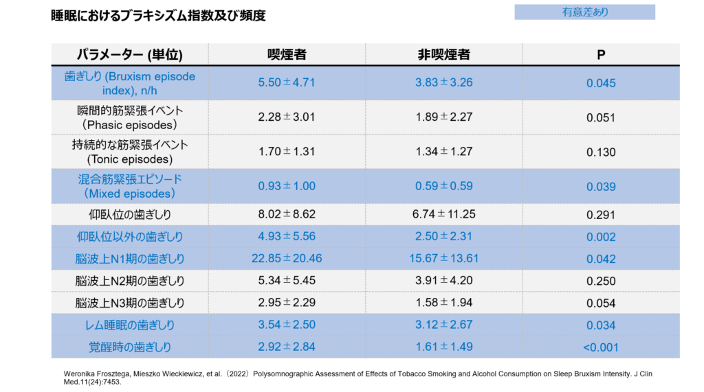 [6] Weronika Frosztega, Mieszko Wieckiewicz, et al.(2022)Polysomnographic Assessment of Effects of Tobacco Smoking and Alcohol Consumption on Sleep Bruxism Intensity. J Clin Med.11(24):7453.