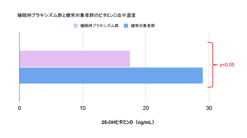 ヨルダンで行われた研究では[1]、睡眠時ブラキシズムがある人とない人各50名の血清中25-OHビタミンD(血液中のビタミンD濃度)と、自己申告による食事からのカルシウム摂取量を比較しました。