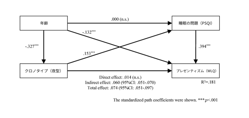クロノタイプが夜型であること自体が直接プレゼンティズムに影響を与えるのではなく、睡眠の問題を通じて間接的に影響していると考えられます。つまり、「夜型だから仕事の効率が悪い」のではなく、「夜型傾向が原因となって生じる睡眠障害」が本質的な問題だということが明らかになったのです。クロノタイプは生まれつきの体質であり、それ自体を変えるのは難しいですが、睡眠の問題を解決することによって、夜型によるパフォーマンスの低下も改善できる可能性があるのです。