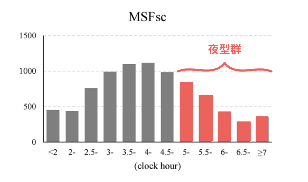 まず、MSFsc(クロノタイプ)の分布は以下のとおりでした。平均値は4:28 (±1:35)であるものの、例えば、4時に寝て10時に起きるような夜型群も一定数いることが分かります。