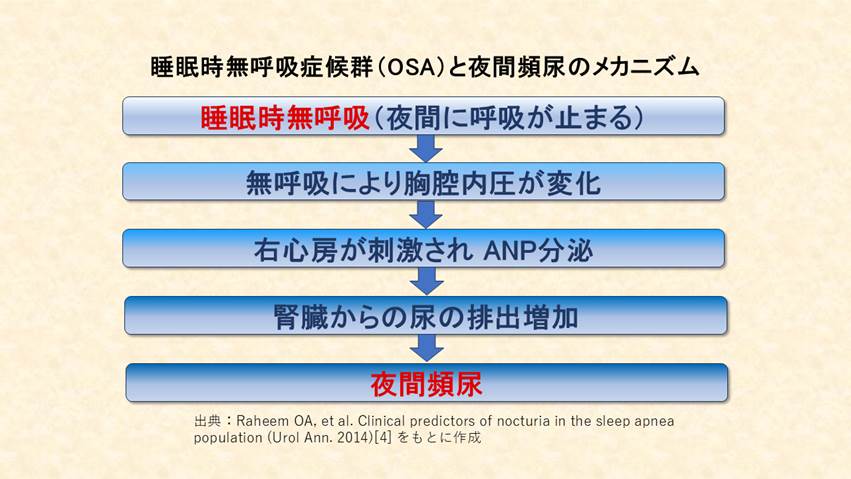 睡眠時無呼吸症候群の方々における夜間頻尿の原因は、まだ完全には解明されていません。しかし、無呼吸により心血管系に負担がかかると、心臓は、体液量を減らすことで心臓の負荷を減らそうとし、心房性ナトリウム利尿ペプチド(ANP)というホルモンを分泌します。その結果、腎臓からの尿の排出が増え、夜間の尿量が増え、夜間のトイレの回数が多くなるのです[4]。