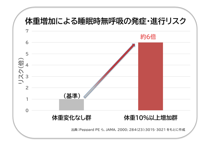 たとえば、体重が10%増えると無呼吸の重症度(AHI)が平均で約32%悪化し、逆に10%減ると約26%改善することが報告されています。さらにこの研究の中では、研究開始時に無呼吸がなかったあるいは軽症だった人で、体重が10%以上増えた人では、新規発症や中等度以上の無呼吸となるリスクが、約6倍になることも報告されています[1]。