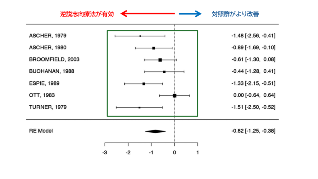 図1は、逆説志向療法と「治療を行わない群」を比較した研究結果をまとめた図です。