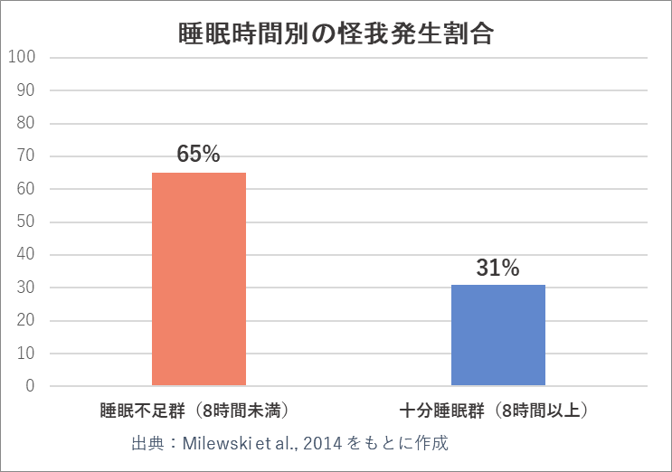 睡眠不足の影響は、パフォーマンスの低下だけにとどまりません。実は、怪我のリスクも高めてしまうことが分かっています。ここでは、スポーツを頑張る12歳から18歳の中高生を対象に行われた、非常に興味深いアメリカの研究をご紹介します[4]。