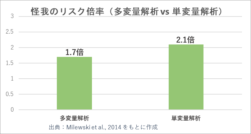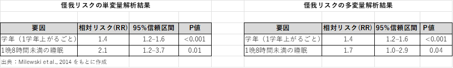 同じ調査で、1晩の睡眠時間が8時間未満の選手は、8時間以上眠っている選手に比べて怪我のリスクが約1.7倍高いことがわかりました(多変量解析:学年や性別、競技種目など他の要因も含めて考慮)。睡眠時間だけで比較した単変量解析では、この差はさらに大きく2.1倍に達しました。