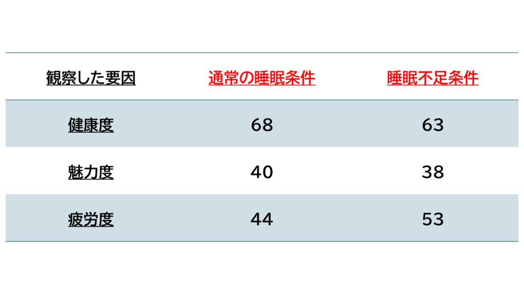 あくまで、睡眠不足の顔は、第三者から疲れて見え、健康度や魅力度の評価が低くなる傾向があったという実験的観察結果です。