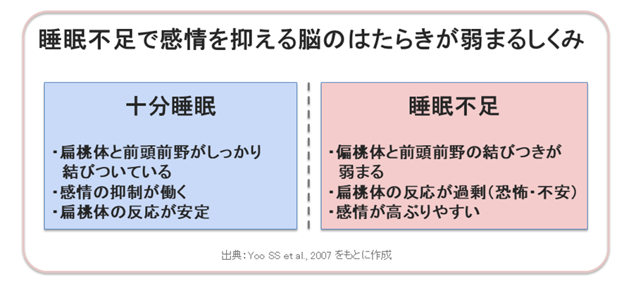 睡眠不足になると、感情を起こす脳のはたらきが過剰に働き、それを抑えるはたらきが弱まることが分かっています。つまり、寝不足のときに気分が不安定になったり、感情の振れ幅が大きくなったりするのは、脳の神経メカニズムが一因として関係していると考えられます。
