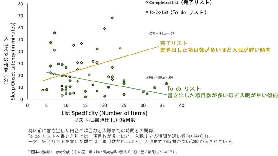 図に示されているように、To do リストを書いたグループでは、書き出した項目数が多い参加者ほど、入眠までの時間が短い傾向がみられました。逆に、完了リストを書いたグループでは、書き出した項目数が多いほど、入眠までに時間がかかる傾向が示されています[1]。