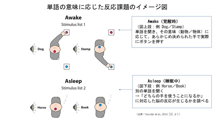 この研究では、参加者が起きている間に、聞こえた単語を分類し、単語の種類ごとに、左右どちらの手でボタンを押すかがあらかじめ決められている課題を十分に練習しました。たとえば、「動物の名前なら左手、物の名前なら右手」といった決まりです。