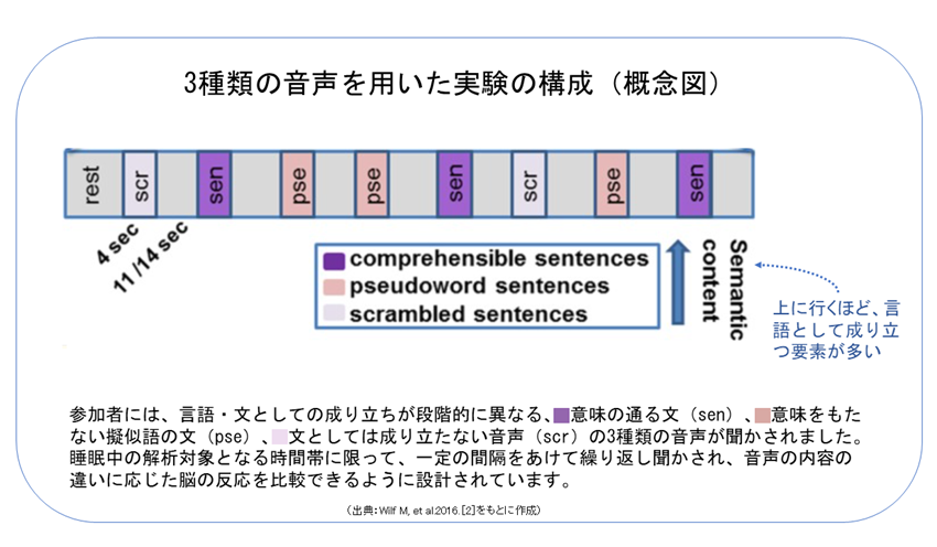 言語としての成り立ちが異なる音声を用いて、NREM睡眠中の脳活動を調べた研究では、音声の内容によって脳の反応がどのように変化するかが検討されました[2]。