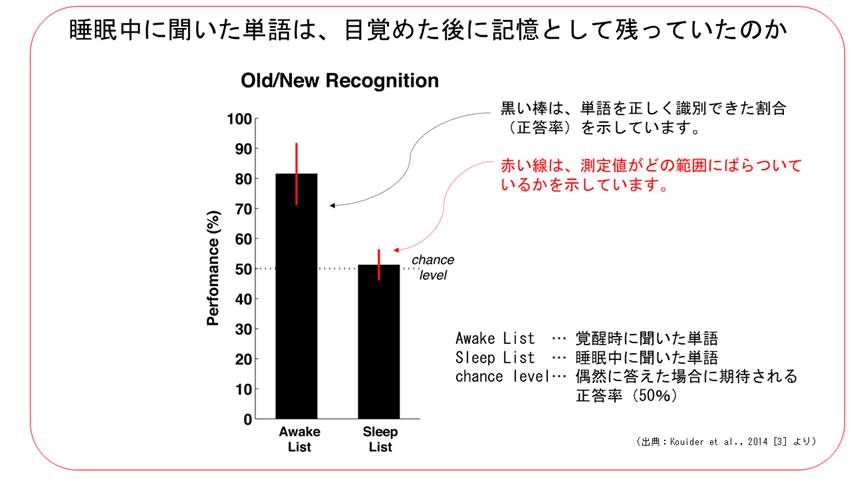 一定の条件がそろう場合には、眠っている間でも、聞こえてきた言葉に応じて、次にとる反応を選ぶ段階に関わる脳の変化がみられることが、実験研究で報告されています[3]。